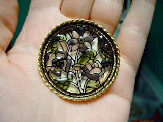 I really don't know that this piece of jewelry is vintage, but I think it's really cute. For one the front is a very pretty faux stained glass floral arrangement that looks really neat. Two if you flip over the back it looks like a foiled Reese's Peanut Butter cup. For the record- I really like candy.
